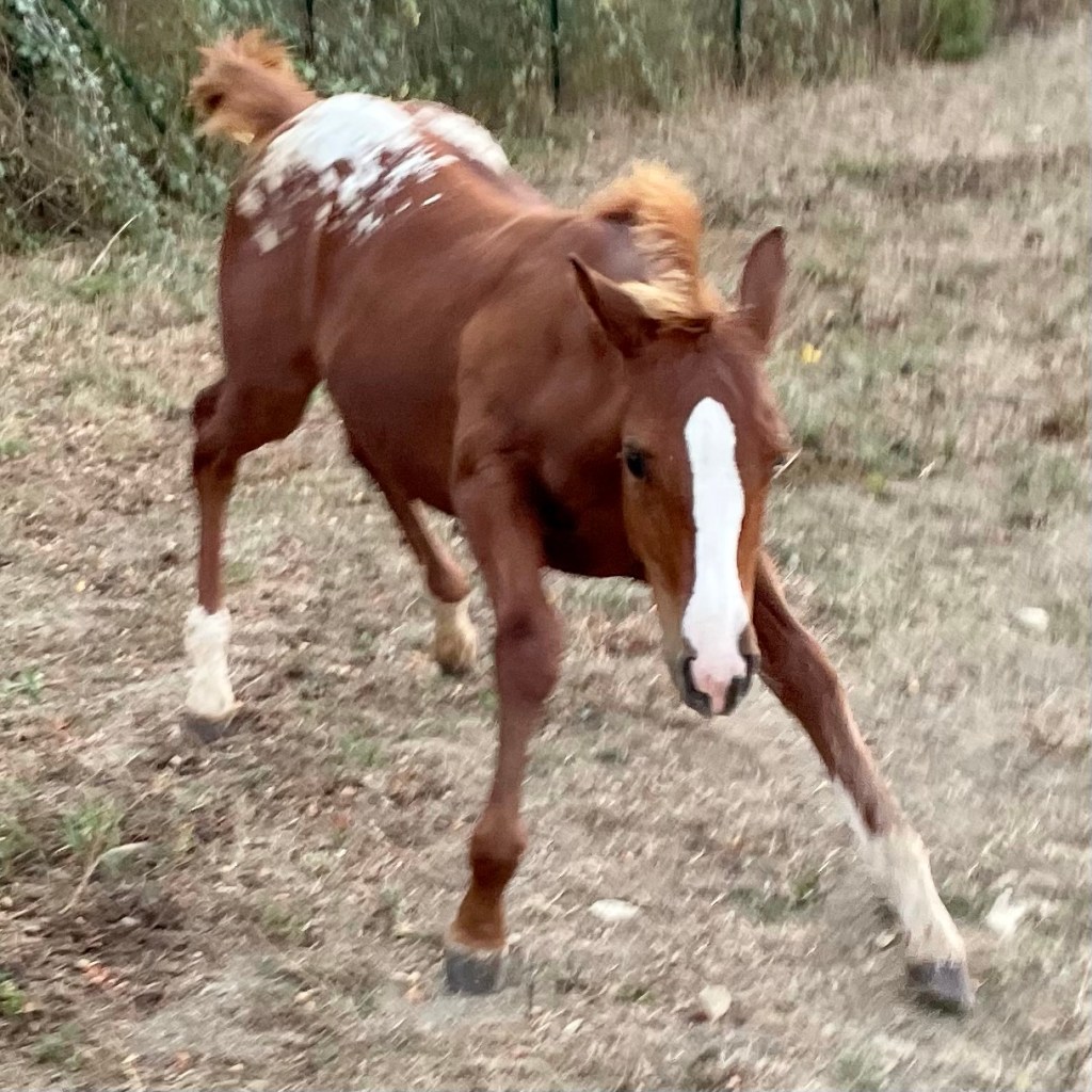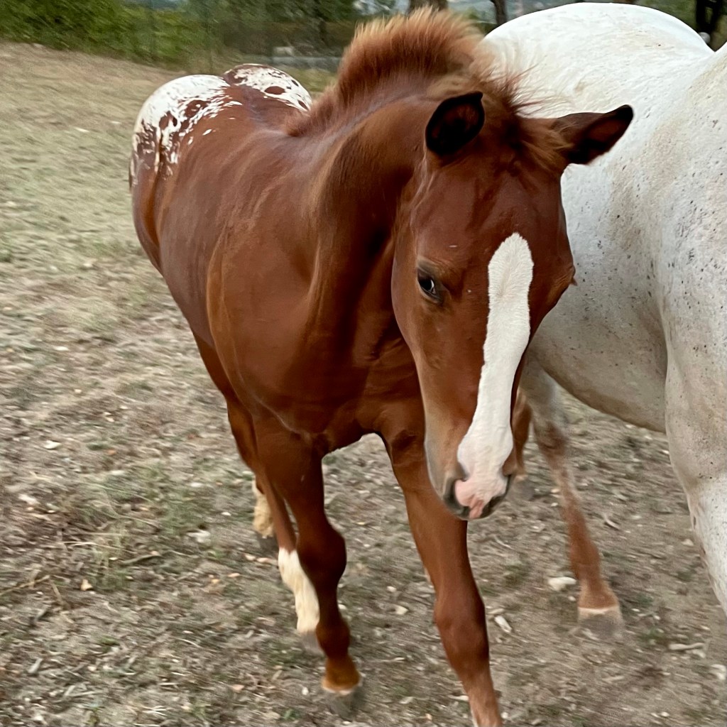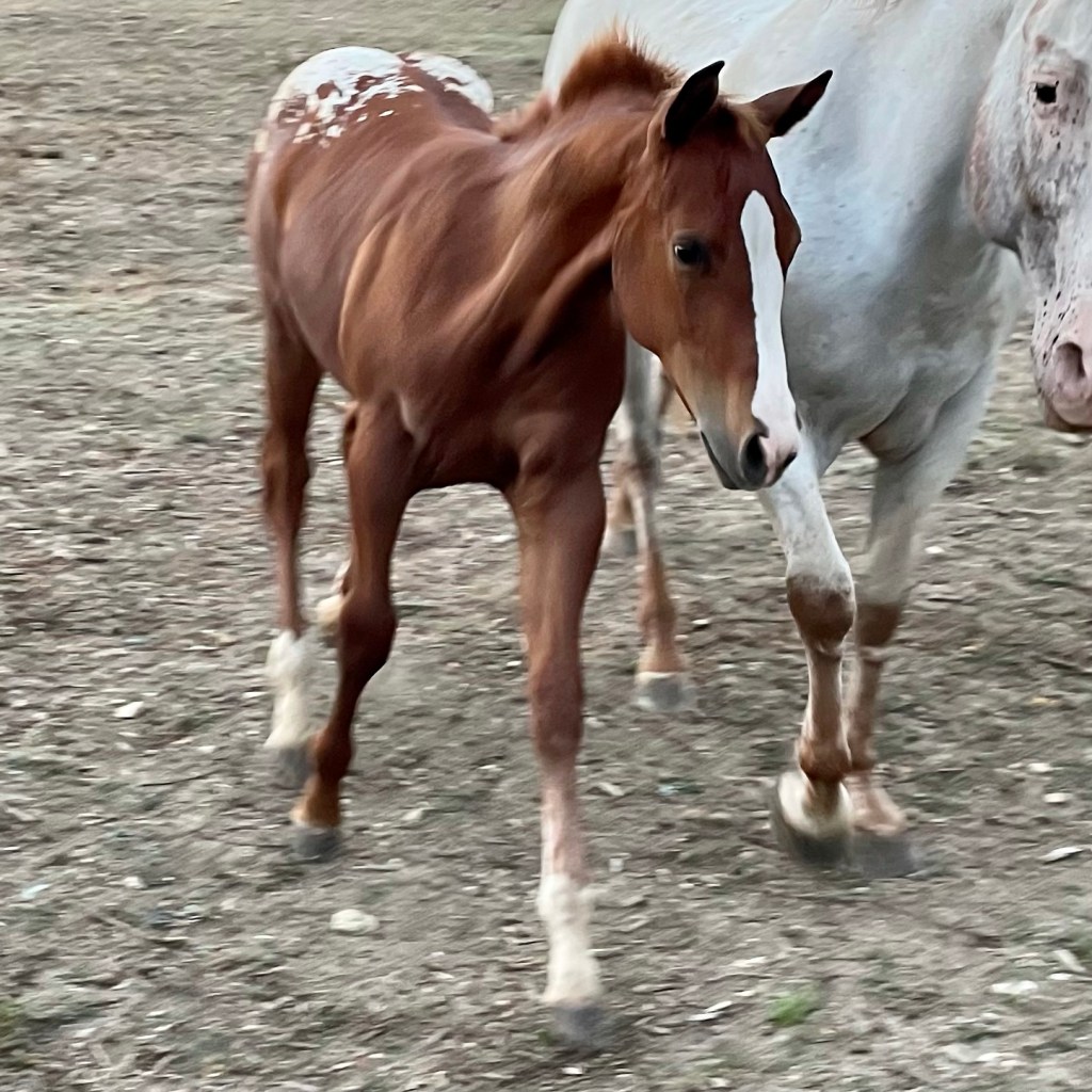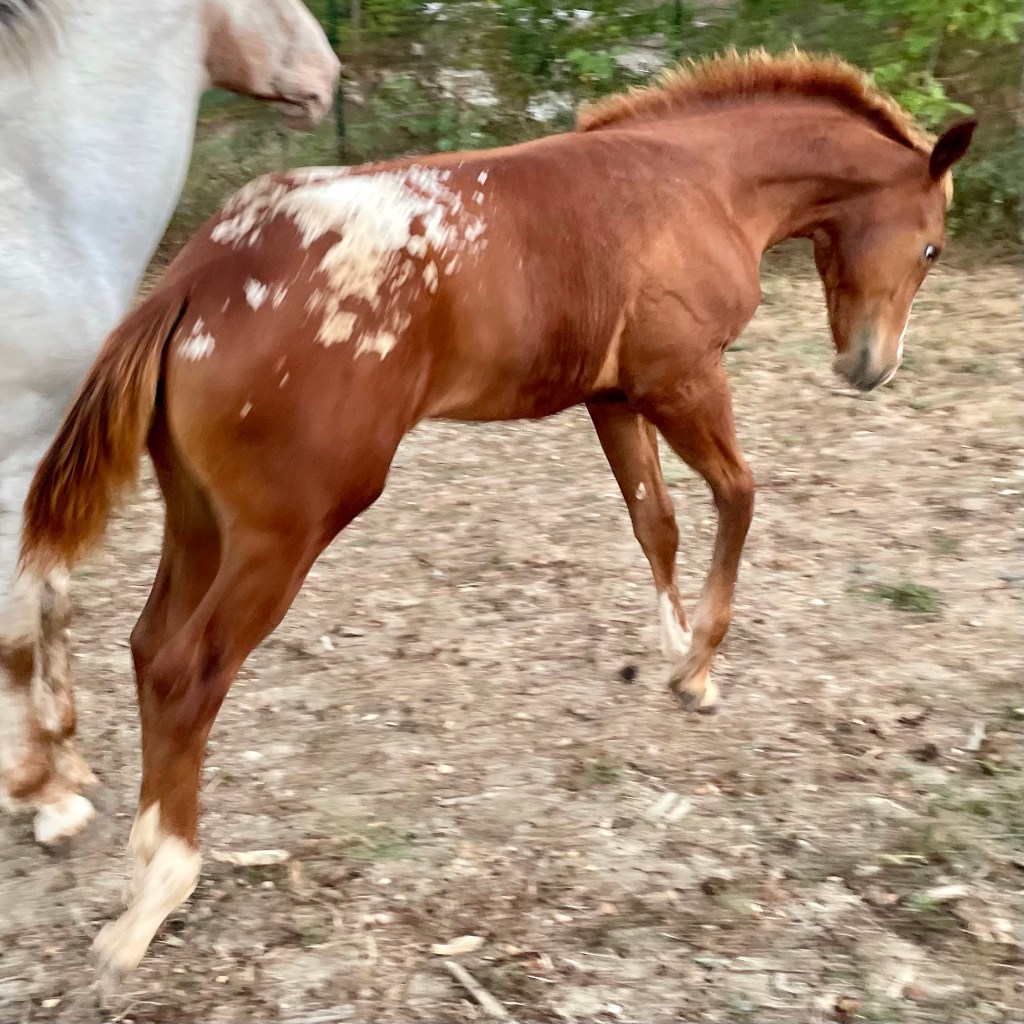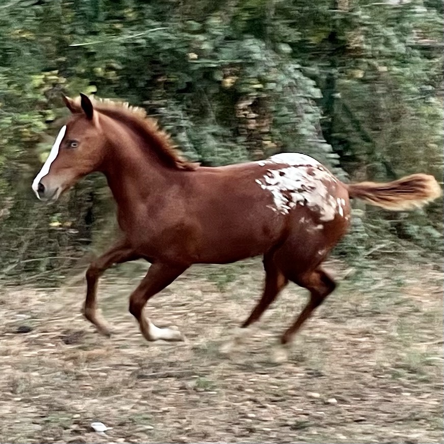 GINNY 🌸 AS SHE MOVES • Day 120 • #blueyedgirl #blanket #sorrel #reining #appaloosa #filly 2021 by Lenas Drawing His Gun X CINNABAR EXHIBIT (European Futurity Open Level 4 Champion X Italian Cup Gimkana Western Non Pro Reserve Champion) #colorfulreiningdream • Follow her life on http://www.spotted.horse
